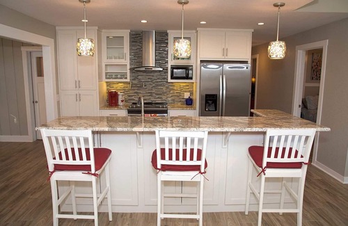 Las características incluyen: 2 camas Queen y 1 cama King, cocina completa con electrodomésticos de acero inoxidable y placa para salpicaduras de azulejos, un amplio sofá seccional para el entretenimiento, 2 baños con encimeras de granito y accesorios nuevos, 4 televisores, cafetera Keurig, comedor para 6, un exterior sala de estar con chimenea, parrilla a gas y 2 estacionamientos fuera de la vía pública
