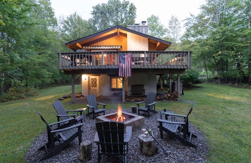 Esta casa es un chalet de esquí clásico súper inmaculado, de lujo, ubicado en 1 acre arbolado privado. Inicio dispone de 3 dormitorios y 2 baños completos, puede alojar cómodamente 4 adultos y 4 niños. Den con estufa de leña y 2 dormitorios abajo, completa con nuevos edredones de plumas. 1 dormitorio con una cama de matrimonio, 1 con 2 literas, capacidad para 4 personas, y un baño completo en la planta baja. El dormitorio principal está arriba, con el área que sería grande para una cuna. Cuenta con techos altos, grandes ventanales, chimenea con vistas a la montaña en invierno. Posh toallas del hotel, nuevos edredones de plumas, walk in closet y un baño principal adjunto. Hay 2 entradas. Entrada principal te lleva arriba a la sala de estar. La entrada en la planta baja se abre a una sala de barro para los equipos de esquí y abrigos. También hay una zona de lavandería con lavadora nueva y secadora. Esto conduce a una sala de estar con tiene un sistema de sonido surround con DVD y TV con servicio de cable y acceso a Internet