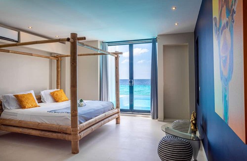Guests have access to a private beach for water activities such as scuba diving, SUP, windsurfing, or kiteboarding. The villa accommodates up to 12 guests in six bedrooms with ensuite bathrooms. There is a big living area, an infinity-edge pool, beachfront hot tub, and balcony with panoramic ocean views.