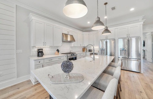 Arriba, en el segundo piso, te sorprenderás con la sala de estar principal. El segundo piso tiene planos de planta de concepto abierto, lo que hace que Live It Well sea el lugar perfecto para organizar eventos grupales. El segundo piso cuenta con un rincón de oficina completo con un escritorio de mármol incorporado, sala de lavandería, sala de estar, cocina y balcón. A lo largo de todo el segundo piso, encontrarás paredes de arpillera, pisos de madera noble y una decoración elegante costera. La sala de estar tiene un televisor de pantalla plana y muchos asientos con dos sofás grises y múltiples sillones. Ubicado justo al lado de la sala de estar, encontrará una lujosa cocina gourmet con encimeras de mármol blanco, dos refrigeradores Cafe de acero inoxidable, una elegante placa para salpicaduras de azulejos, cocina de seis quemadores, fregadero de la granja, cafetera Cuisinart y una barra de desayuno. cuatro asientos. Además, hay un comedor formal junto a la cocina con una gran mesa de comedor con capacidad para siete personas. Además, los huéspedes pueden salir al balcón y disfrutar de un comedor al aire libre con capacidad para cuatro personas.