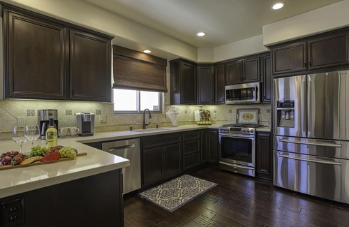 Las áreas de sala, comedor y cocina se encuentran en el primer piso. Los huéspedes se mueven fácilmente de una sala a otra con el plano de planta abierto del condominio. Tome su lugar en el sofá de gran tamaño mientras mira televisión. Hay un sofá cama doble en la sala de estar. La cocina cuenta con electrodomésticos de grado gourmet, encimeras de cuarzo y está bien equipada con utensilios de cocina y platos para servir. La mesa de cocina rústica de gran tamaño tiene capacidad para 8, con asientos adicionales en el bar de la cocina.