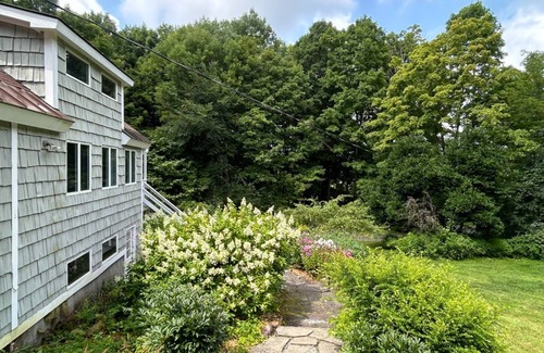 Our home in the woods is truly peaceful. It's situated on 10 acres in a circle of trees. Windows are plentiful, so you can see magical woods and fields on all sides. The house is spacious and enjoys being filled with people. It has five comfortable beds in three bedrooms with two ensuite bathrooms and one downstairs bath. The kitchen is newly refinished, as is the master bath. There's plenty of parking spaces for cars, and fields to roam in if you want a short nature hike.