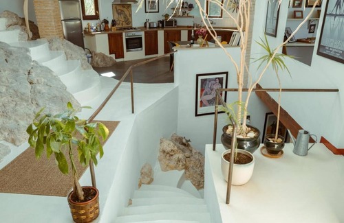 Un atrio piramidal es el eje visual alrededor del cual gira el salón / comedor de planta abierta. Tres enormes ventanas conducen a la terraza y a la piscina de borde infinito cuyas aguas parecen fusionarse con el cielo. La sala de estar, la cocina / comedor y el estudio son un gran espacio abierto, hay un gran dormitorio principal, un baño extraordinario y cientos de libros, CD y pinturas.