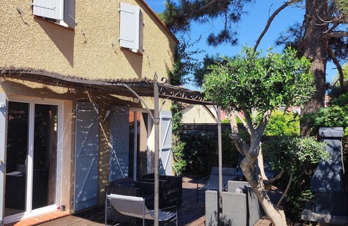 Su situación es muy tranquila, al final de un callejón sin salida. A un tiro de piedra de la playa, está a solo metros de distancia en línea recta y de fácil acceso a pie, incluso con niños pequeños. Un mobiliario de jardín de teca debajo de una pérgola plantada le permite mantenerse fresco y un salón al aire libre debajo de otra pérgola para disfrutar del espacio al aire libre y la piscina. La piscina con una dimensión externa de 3.5 x 3.5 dimensiones de la cuenca 3. 16 x 3. 16 profundidad de 135 cm integrada en la terraza, es segura e ideal para niños pequeños.