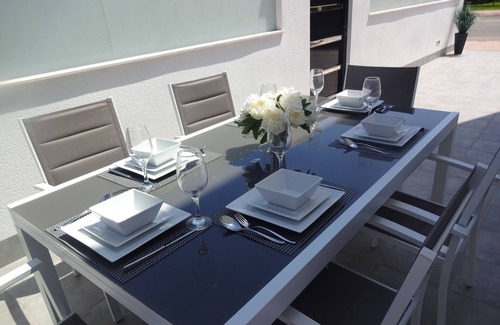 Villa Blanca ofrece el espacio vital individual privado perfecto, con puertas corredizas de vidrio que se abren directamente a una gran terraza con piscina privada, patios cerrados con estacionamiento fuera de la carretera. Aproveche la opción del amplio solarium en la azotea para disfrutar del sol durante todo el día, con una cocina para barbacoa al aire libre y un jacuzzi para 6 personas.