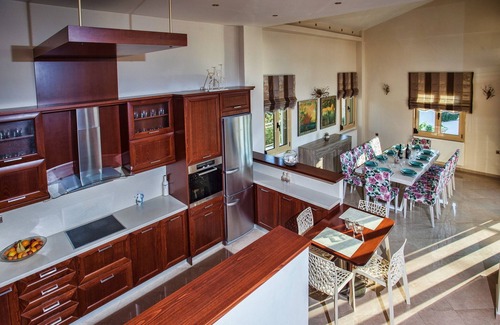 Una escalera de mármol abierta (ocho escalones) conduce al piso superior, donde se encuentra una cocina muy bien equipada con cocina eléctrica completa, horno eléctrico, microondas, lavavajillas, nevera / congelador, cafetera, tostadora, licuadora y hervidor eléctrico. En el mismo nivel de la cocina se encuentra el comedor con una gran mesa de comedor para 12 personas.