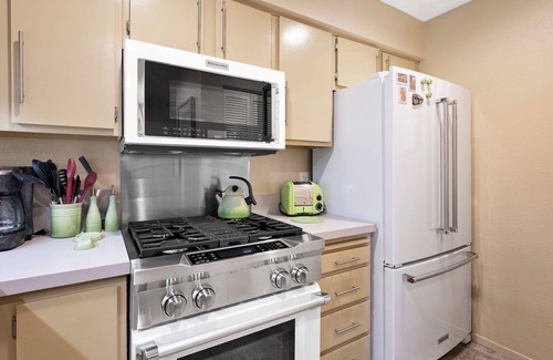 Nuestra cocina bien equipada cuenta con electrodomésticos actualizados, que incluyen una estufa de gas de cinco quemadores, un lavaplatos silencioso Bosch ™, una gran nevera con máquina de hielo y un gran microondas incorporado. Espera encontrar todos los utensilios de cocina que normalmente encontrarás en casa.