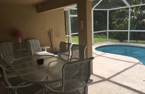 Nuestra espaciosa y luminosa villa con aire acondicionado está ubicada en una zona tranquila de Port Charlotte, pero cerca de todo lo que Port Charlotte tiene para ofrecer. Nuestra casa tiene tres dormitorios y dos baños. El dormitorio principal tiene una cama tamaño king con deslizadores en la cubierta de la piscina, un amplio vestidor y un baño con dos lavabos, cabina de ducha y bañera de jardín. La casa tiene un salón formal, un comedor con deslizadores en la cubierta de la piscina, una cocina bien equipada que da a una sala de televisión familiar. Dos habitaciones más (una doble, una individual) comparten el segundo baño. La casa tiene un cuarto de servicio con una lavadora y secadora. Hay una pequeña área de estudio y un gran garaje doble. La casa cuenta con acceso a internet wifi gratuito, un televisor de pantalla plana grande de alta definición en la sala de estar, el dormitorio principal también tiene un televisor de alta definición más pequeño.