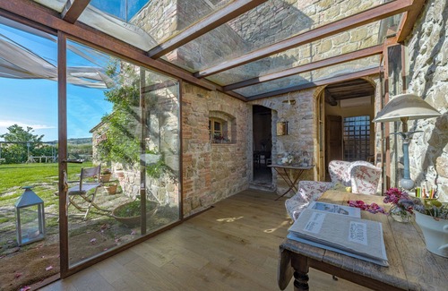 Tres pasos por encima del nivel de la cocina hay una sala de estar con chimenea y mesa de billar. Otros tres pasos conducen a un área pequeña que conduce a una habitación doble (posiblemente dos camas individuales) con su propio baño y ducha. A la izquierda de la cocina, subiendo tres escalones, hay un pequeño porche acristalado. Este es un lugar mágico en cada estación y el lugar perfecto para leer un libro y tal vez tomar una buena copa de vino Brunello mientras está afuera y respira las hierbas aromáticas del jardín. Hay una entrada a una gran sala de estar con una gran chimenea, cómodos sofás, una biblioteca con muchos libros, equipo de música, televisión con DVD. Al lado del salón hay una pequeña cocina (horno,
