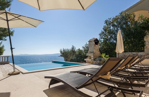 Villa frente al mar con piscina climatizada, cubierta de teca, con vistas al mar abierto, barco barco en el puerto | Villa en Okrug Gornji