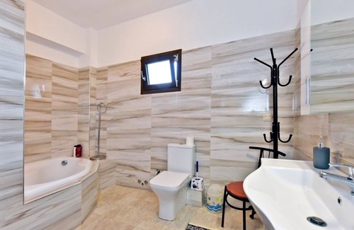 Villa George by RentalsPro Services in Nea Potidea, Halkidiki is a beautiful 140 sqm house with excellent garden views. It has three large bedrooms with double beds, and can comfortably accommodate up to 8 people. In addition, there are 2 bathrooms with washing machine for the comfortable stay of guests.