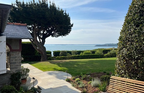 The Cocoonr / Book&Pay agency offers this superb character house from 1910 for rent in Saint-Cast-le-Guildo, with panoramic sea views, just a few minutes' walk from the Grande Plage and the town center. A true haven of peace, the Villa has been recently renovated and elegantly furnished to accommodate up to 10 guests: a large, bright kitchen, a beautiful living room with a sitting area, fireplace, and library, 8 comfortable bedrooms, 5 bathrooms, 3 separate toilets, and a 2,500 m² wooded garden with several terraces to enjoy the great outdoors. Wi-Fi included, all that's missing is you! No guests allowed.