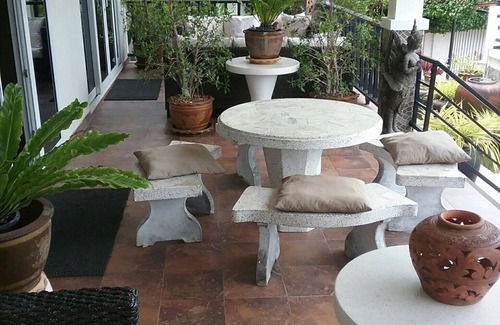 La villa se encuentra en una gran parcela con magníficos jardines y muchos arbustos y flores tropicales. Hay una gran terraza delantera cubierta de 10x3 metros que se eleva sobre el jardín para proporcionar excelentes vistas del gran estanque de peces. El estanque corre a lo ancho de la casa y contiene muchas plantas acuáticas dentro y plantas tropicales que lo rodean. En la terraza hay una mesa de comedor de mármol de estilo tailandés con asientos de banco a juego, 2 sofás, 2 sillas y mesas para bebidas. Al lado hay una cochera grande y un jardín con hermosas buganvillas de varios colores.