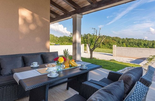 Casa de vacaciones de nueva construcción Gita se encuentra en una ubicación tranquila, al borde de un pueblo con una hermosa vista de los alrededores. Es moderno y bien decorado y es ideal para familias con niños. Villa Gita es una casa de vacaciones con piscina privada (32 m2) en el centro de Istria con una vista mágica de los alrededores bellamente ajardinados. Puede alojar hasta ocho personas. La villa tiene su propia parcela cercada de 1200 m2 con un césped bellamente ajardinado. Consta de tres dormitorios con camas dobles, dos baños, una cocina moderna amplia y totalmente equipada que está abierta al comedor y la sala de estar, y una terraza cubierta con muebles de asientos con vistas a la zona de la piscina. También cuenta con barbacoa, TV vía satélite, lavadora y aparcamiento privado. La casa está completamente climatizada.