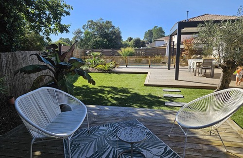 Orientada al sur, gran terraza de madera con piscina ideal para niños pequeños (2x2 profundidad 80 cm), jardín, tumbonas, barbacoa.