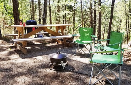 Our beautiful 20' Crow Tipi sits among the pine trees with nice mountain views. The smoke flaps on this tipi can be open at night for a view of the stars. The wrought iron queen size bed with comfy linens has a candlelight chandelier hanging over the bed for a romantic feel. There is a small table with 4 chairs and a chest that holds dishes, silverware, cooking utensils, drinking glasses and pots & pans. An electric coffee maker with coffee, tea bags and condiments is provided. Towels, wash cloths and hand towels are provided also. A blanket chest sits at the end of the bed and holds blankets for use by the firepit, games, books and first aid kit. This year we have added electricity to the tipi!! There is now a small refrigerator, microwave, blow dryer, floor fan for warm days and plugs to charge all your devices.