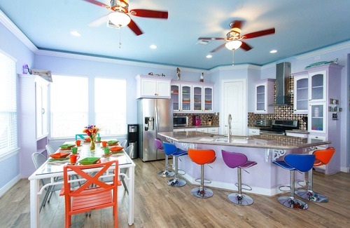 Las palabras no pueden hacer justicia a esta casa. Las imágenes valen más que mil palabras, así que mira estas hermosas fotos de esta increíble casa de 3500 pies cuadrados que puede alojar hasta 40 (CUARENTA) personas. Deja que las fotos hablen por ti. DOS salas de estar, cada una mide 20 X 40 pies con DOS hermosas cocinas de concepto abierto y DOS comedores con 22 ventanas para que vea, sienta y escuche el majestuoso sonido de las olas del Golfo de México. 6 habitaciones grandes y bellamente diseñadas con literas XL construidas a medida que están diseñadas para dormir adultos o niños. Diseños náuticos únicos para dar la sensación del océano y el mar mientras usted tiene la noche más cómoda para dormir en nuestros colchones de espuma con memoria de gel de 8 ". Realmente fuimos más allá de la norma para brindarte la experiencia más maravillosa que puedas tener en una casa de playa. El trabajo de arte náutico oceánico decora las paredes de toda la casa. Las cocinas están abiertas con gabinetes a medida que tienen puertas de vidrio para que pueda ver qué hay dentro de los platos, ollas y sartenes muy coloridos y utensilios de primera línea. 4 baños con lavamanos y duchas personalizadas que tienen grandes cabezales de ducha refrescantes que definitivamente te harán amar la sensación de limpieza nuevamente.