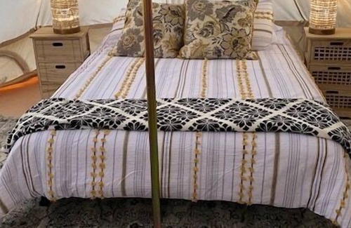 This is the third yurt on the left. This is a true glamping experience! The yurt is a one room tent with a queen size bed, 2 side tables, 2 lamps, a lounge chair and a coffee table. For cool nights there is a space heater, and a large fan for warm evenings. The doorway is a double zip closure.